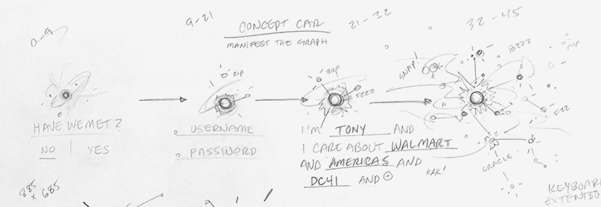 For this project, I created a visualization of the 'personal' product graph. Slowly and solitary at first, but responding excitedly with each new response from the user. The nodes brighten, multiply, and swirl with exponential intensity. The characteristics of a new life forming and being insatiable for data consumption. Once the user clicks the go button, our Samantha begins to build an even greater and bigger cloud of swirling nodes for the user. The user is emotionally engaged and excited to see what is behind the door.
